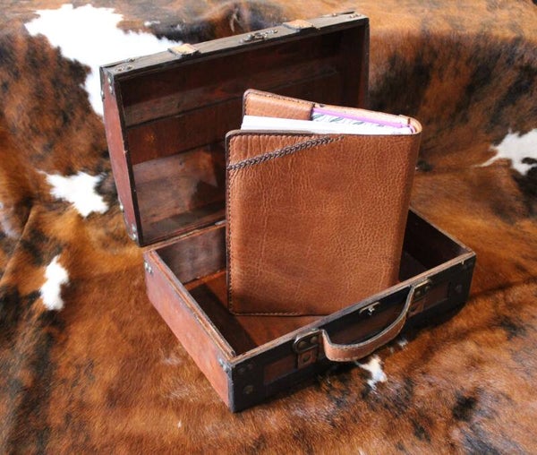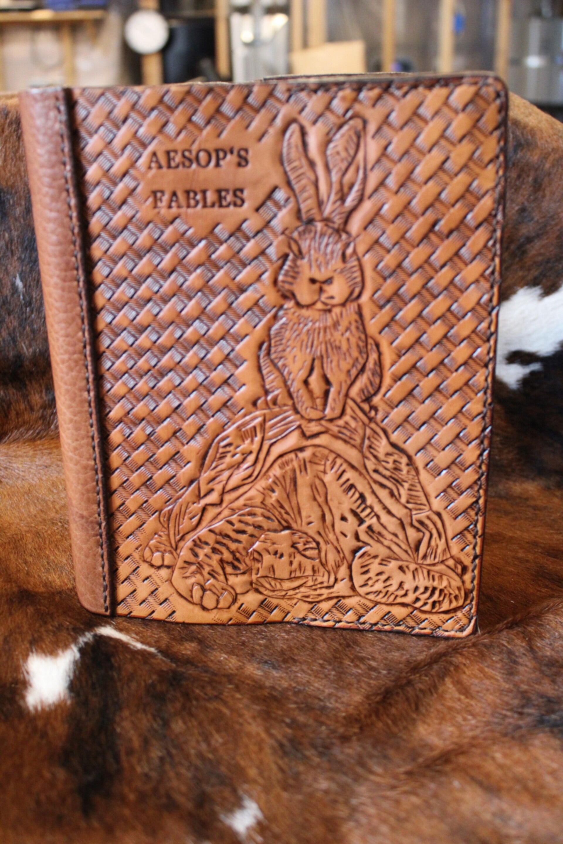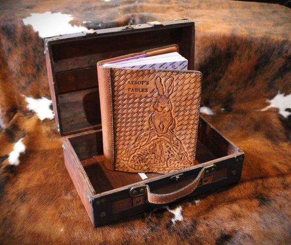 This beautiful leather cover captures the classic tale of The Tortoise and the Hare. Featuring a buffalo leather accent and a basketweave background, this book cover is handstitched to make this story last for generations.
