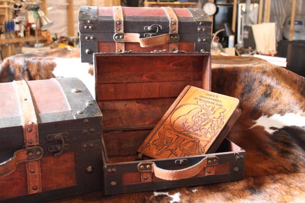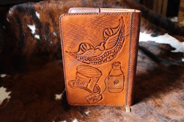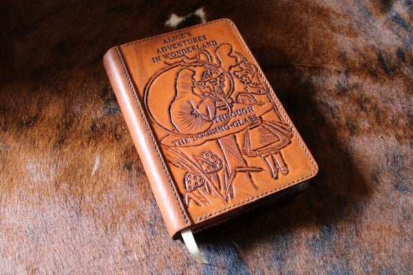 Step through the looking glass to meet Lewis Carroll's beloved characters with this hand-tooled cover. Tooling highlights the stories within, from the mischievous grin of the Cheshire Cat and the Caterpillar on his mushroom. Hand-stitched and accented with buffalo leather, bring home a classic and enter Wonderland.