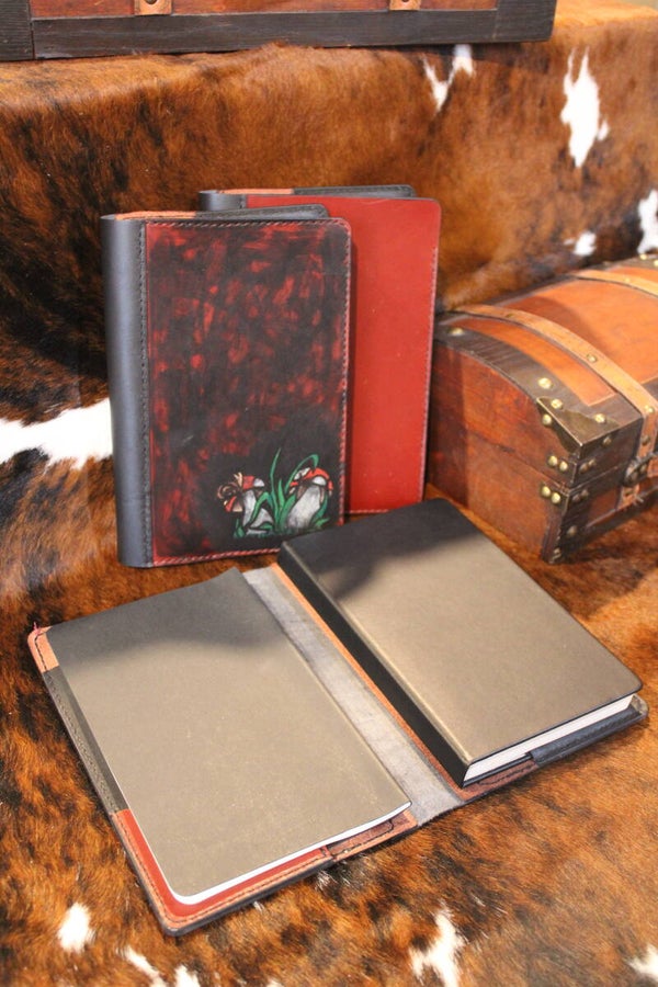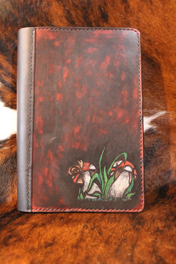 Journals come with red cowhide fronts and backs with a black spine and pen holder. Our limited edition cover also features a handtooled and handpainted mushroom set.