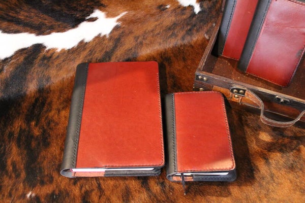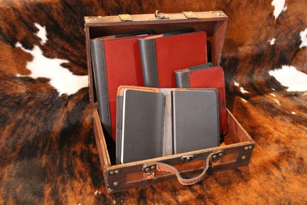 Our Moleskin journals are made to hold two journals, one for each pocket, and feature a pen holder as well. A smooth cowhide cover and hand-stitched seams allow for durablity for your travels, regardless of how busy you might be.