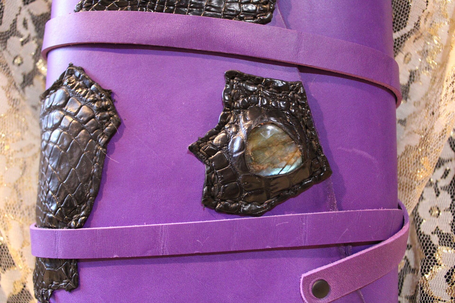 With purple cowhide and black crocodile, this cover is made to fit a hardcover journal. To add to its whimsey, a stone has been moulded into the cover; what mysteries this stone may hold, no one is sure.